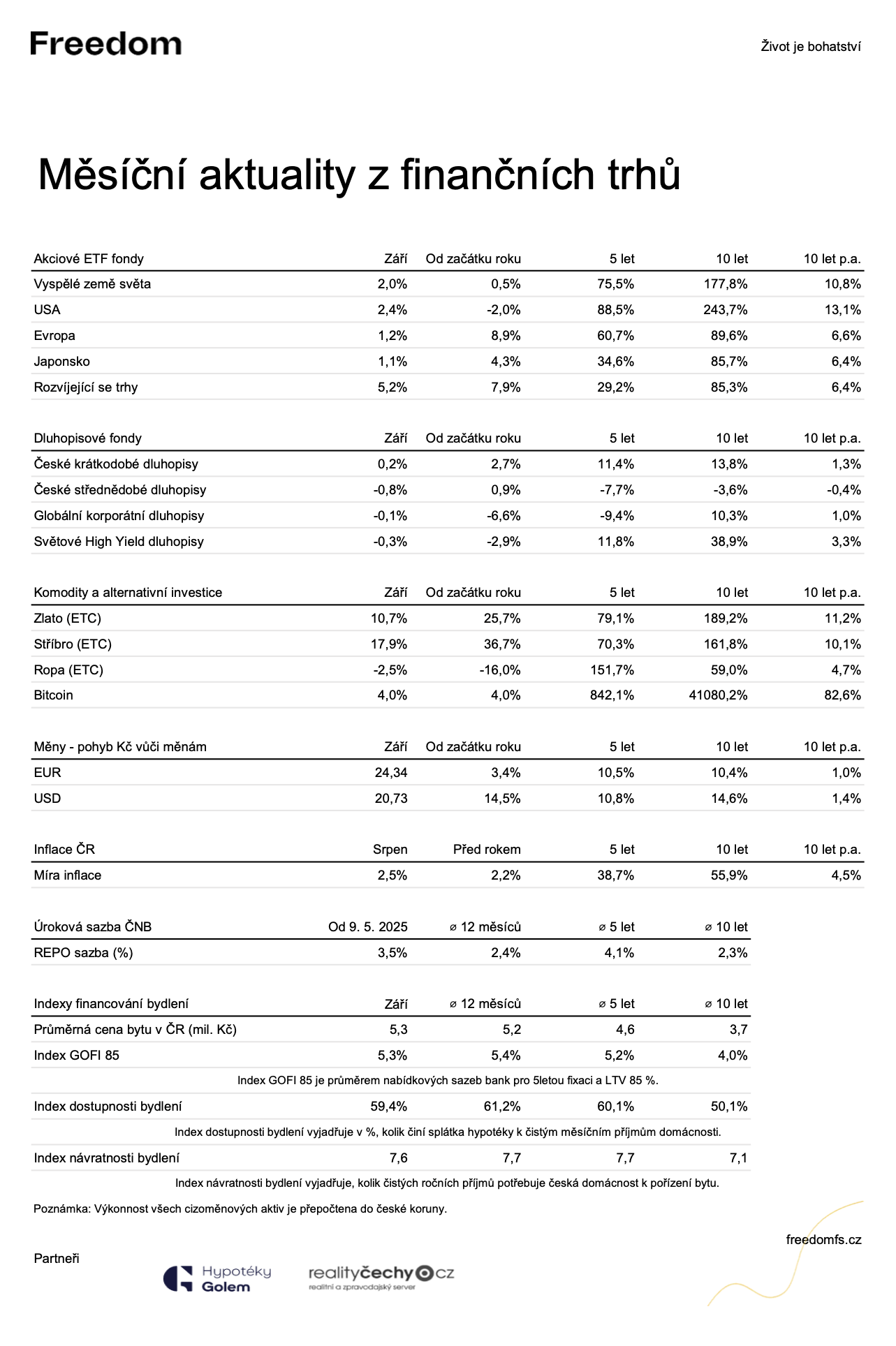 Finanční trhy v září potvrdily svou schopnost pružně reagovat na globální impulzy. Zatímco akcie a komodity zaznamenaly výrazné cenové zisky, dluhopisy byly v mírné kontrakci. I když byla potvrzena dohoda o clech mezi EU a USA, tak lze říci, že rizika spojená s geopolitickým napětím, obchodními spory a měnovými výkyvy stále nezmizela. Centrální banky nadále usilují o stabilizaci měnové politiky.